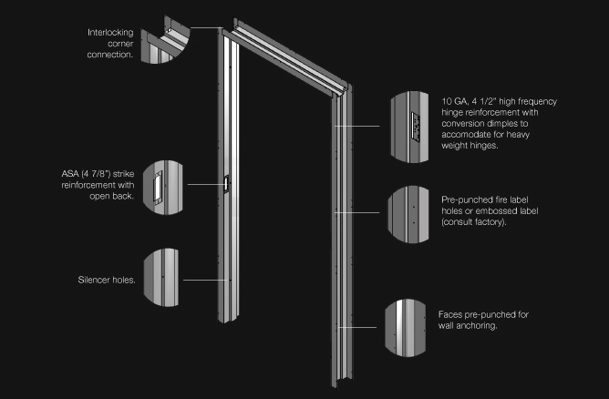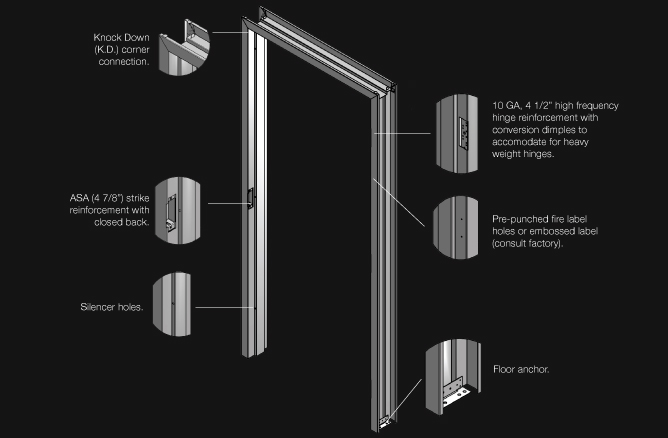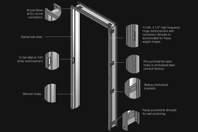 MAS Series Frames are made to suit masonry applications in commercial, industrial, or institutional settings. These frames come complete with floor anchors and are available in 18 GA or 16 GA. MAS Series Frames can be made to accommodate a wide variety of sizes and jamb depths and can be fire rated up to 3 hours.